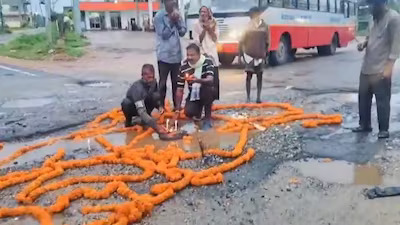 Residents can be seen standing in the middle of a busy road with their hands folded in a video that has gone viral online. The pothole is adorned with incense sticks, diyas, and a big garland. They used this innovative tactic to highlight the dilapidated and long-ignored state of roadways.