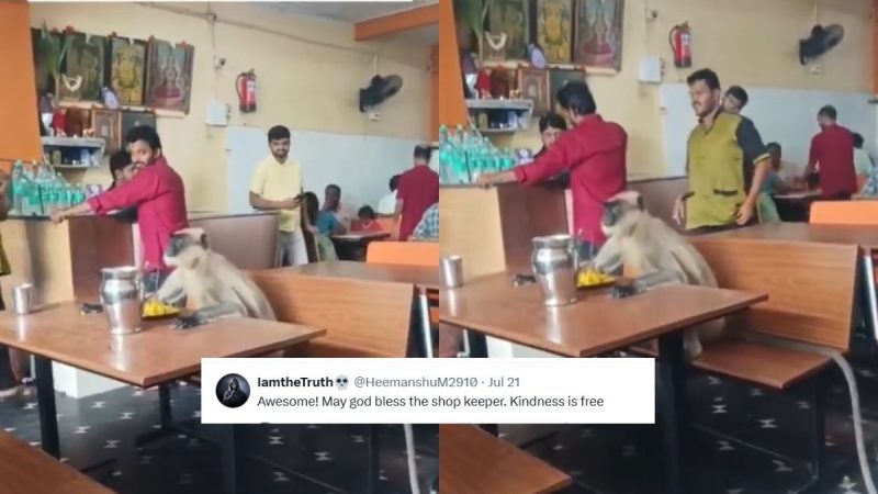 A video that Pet Adoption Bangalore shared on X (Twitter) captured the hearts of internet users and went viral. The video shows a monkey seated at a hotel table in Karnataka. However, the staff’s response caught them off guard. They fed the monkey instead of chasing him away, and he ate in silence without complaining or causing any trouble.